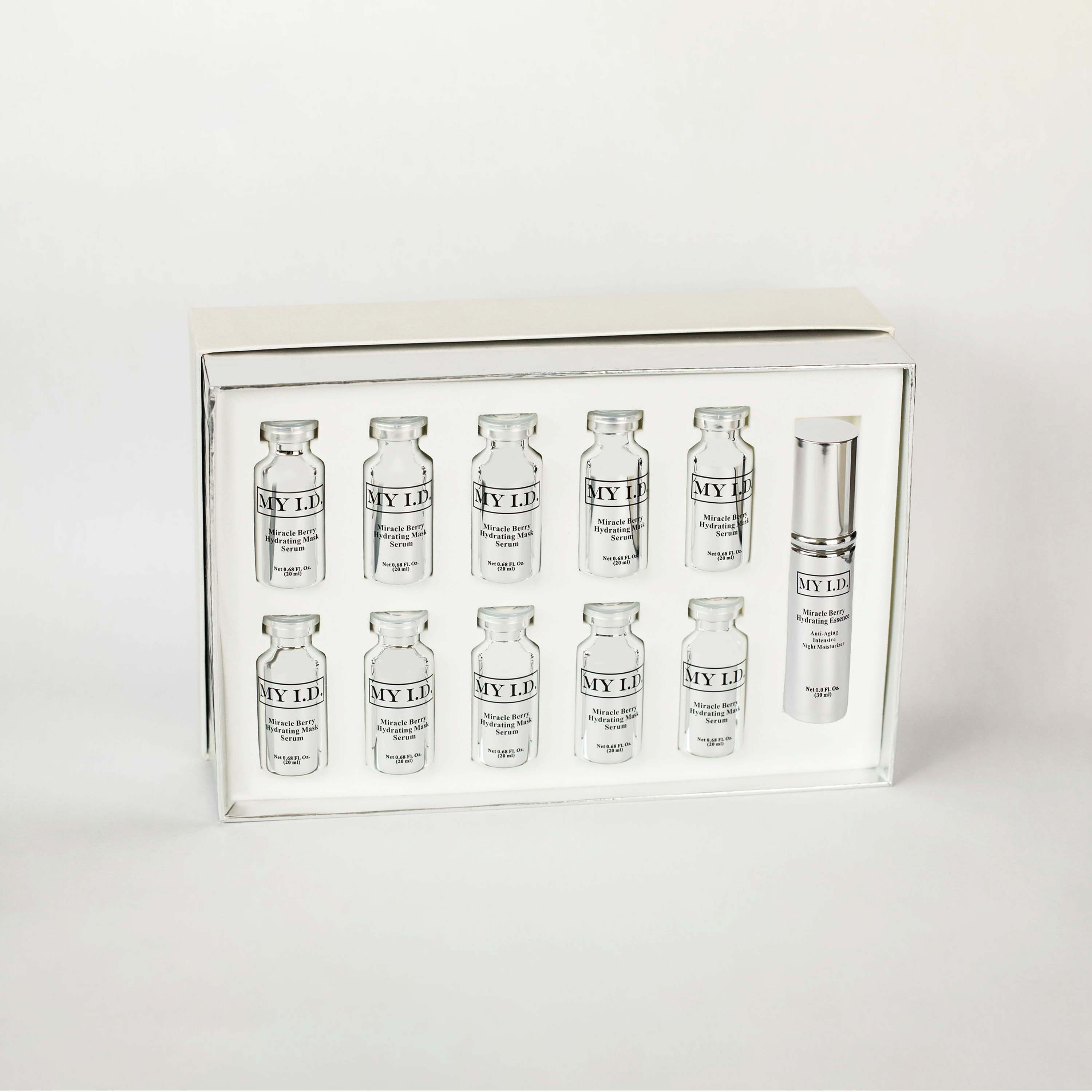 Miracle Berry Hydrating Essence (30ml) Miracle Berry Hydrating Mask Serum (10 x 20ml) Compressed Silk Sheet Mask (10) Immersion Cup (1)